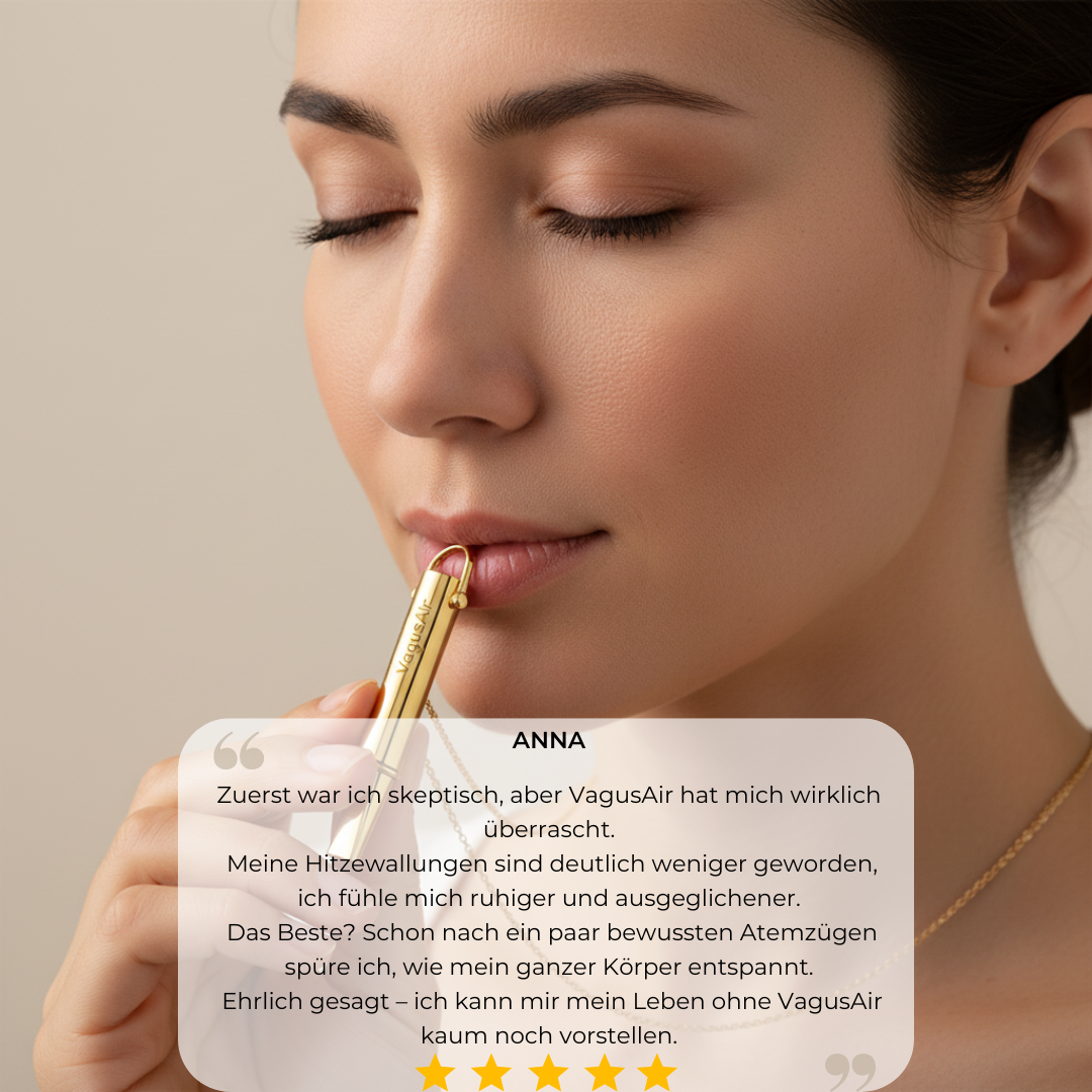 Petra FEB 2025Weniger Stress, besserer Schlaf!Seit ich den VagusAir benutze, habe ich meinen Stress endlich im Griff.Meine Hitzewallungen sind fast verschwunden, und ich schlafe deutlich ruhiger und tiefer.Ich wache erfrischt, ausgeglichen und voller Energie auf – jeden Tag!VagusAir™ – Der Atem zur inneren Ruhe