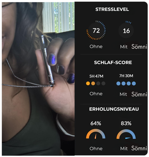 Anja FEB 2025Ruhe, weniger Migräne – ein Wunder!Früher lag ich stundenlang wach und konnte nicht abschalten. Mit Sömni finde ich endlich Ruhe. Mein Geist wird ruhig, mein Körper entspannt sich – und meine Migräneanfälle sind seltener und schwächer. Für mich ein kleines WunderVagusAir™ – Der Atem zur inneren Ruhe